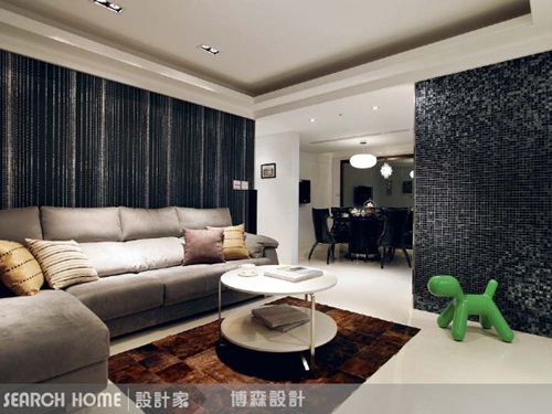 秘技2 琉璃馬賽克讓牆面有表情 博森設計考量到屋主顧忌玄關入口有穿堂煞的禁忌,設計師於此透過琉璃馬賽克隔屏設置,解決了風水上的問題,而建材本身的質感與反射特質,結合嵌有施華洛世奇水晶的燈具,與光線共同展演出別致的光影效果。