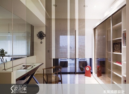 秘技5 玻璃隔間妙用無窮 為了要讓陽光進到採光量較少的客餐廳,書房的隔間與門都使用透明玻璃,從餐廳就可以看到書房外的前陽台。在書房玻璃推拉門貼上玻璃貼紙,在推拉門片時,產生線條重疊的有趣視覺,不只放大空間,也帶來俐落感。