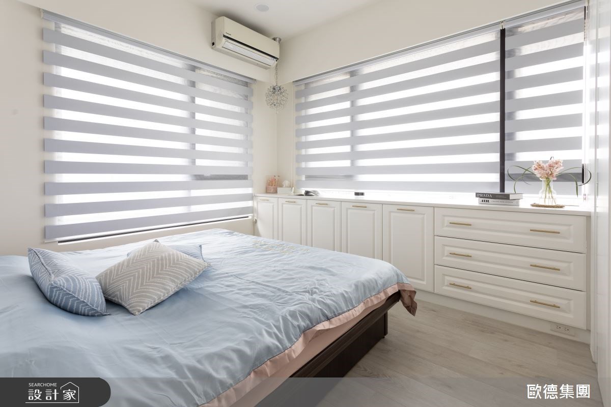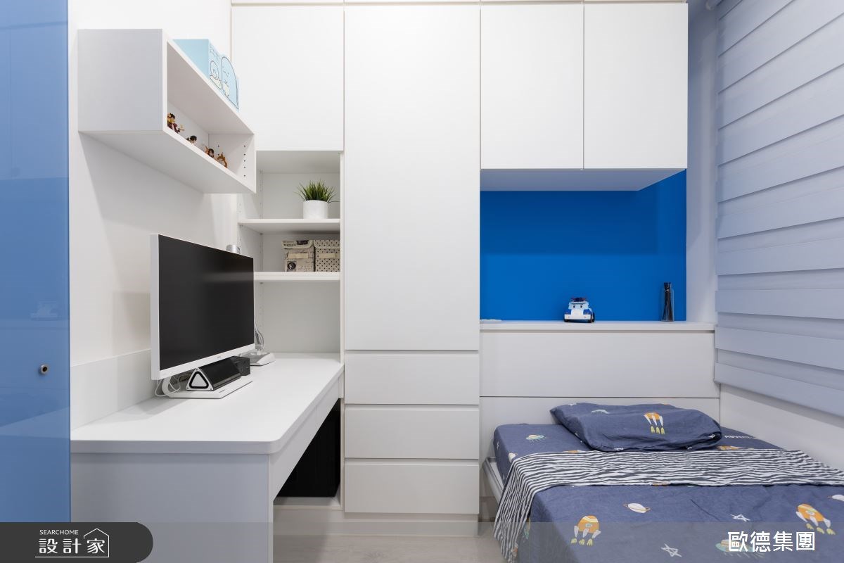 主臥透過木作隱藏門,巧妙把衛浴入口和衣櫃收納整合於內,而且因為陽光個性的女屋主喜歡雙面大窗戶的明亮採光,所以設計師規劃了陶瓷烤漆系統櫃於窗台下方,並裝置調光捲簾維持通透感。次臥為男孩的起居天地,將書桌、衣櫃、床頭櫃整合為 L 型,而亮麗藍跳色粉刷的床頭櫃背板,則更顯孩子的充沛活力。