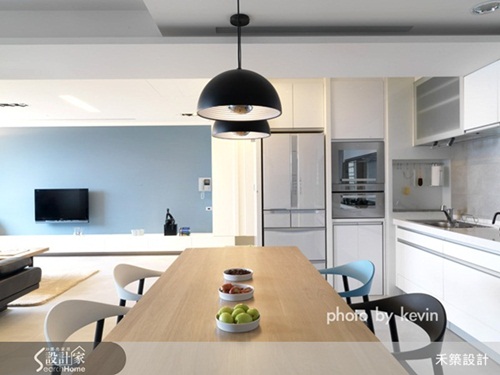 宛如半顆蛋的黑色造型燈飾懸掛在木質餐桌上,以無隔間的開放式設計和廚房相容何,相當北歐!眼尖的你應該也發現了,電視牆和右邊椅子都是「藍」色的呢!