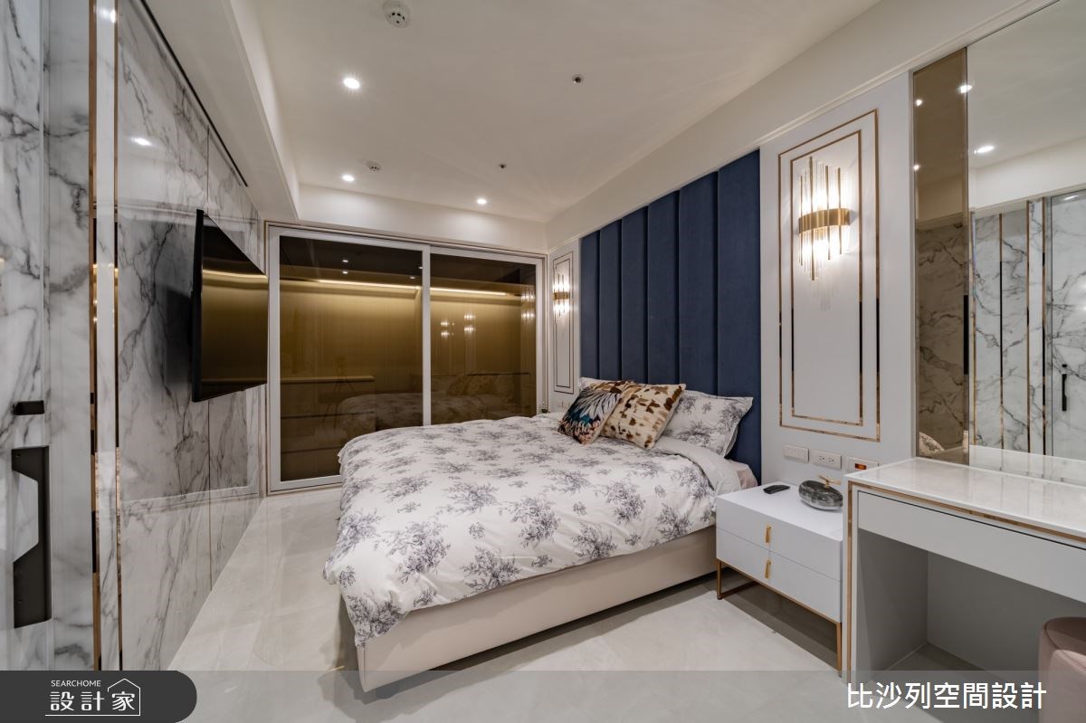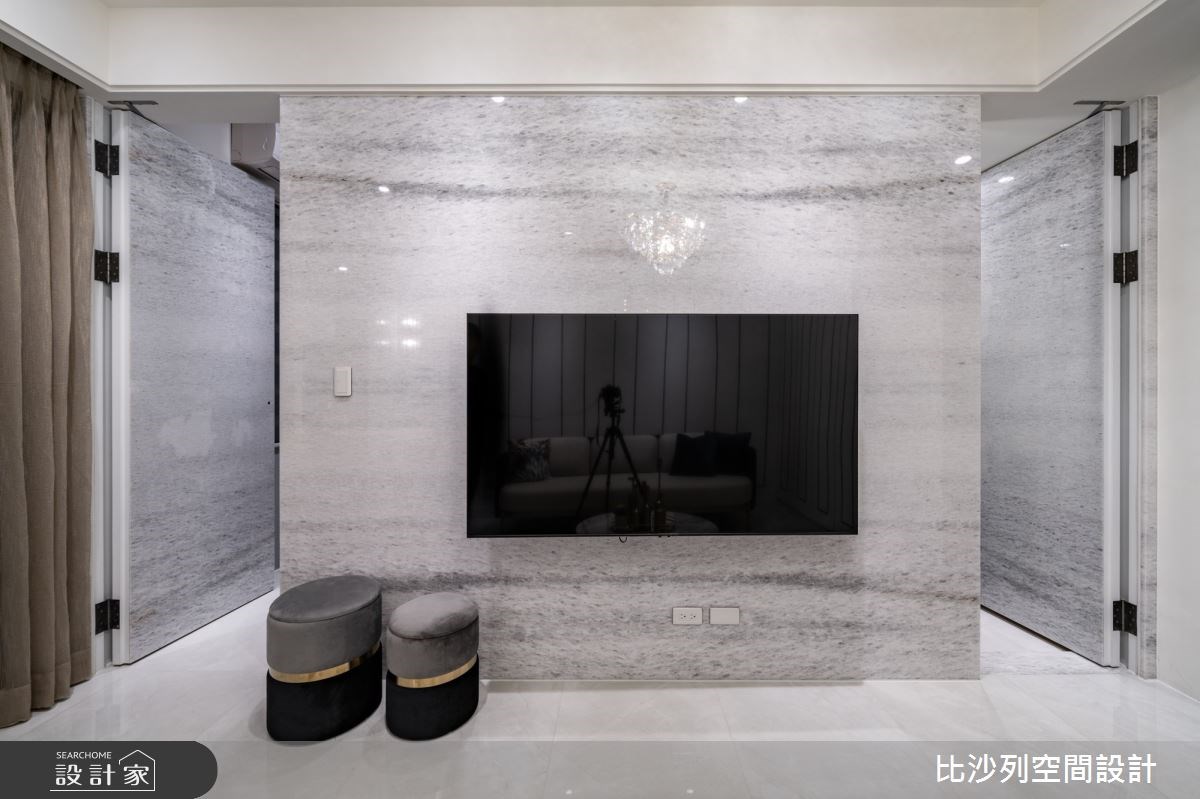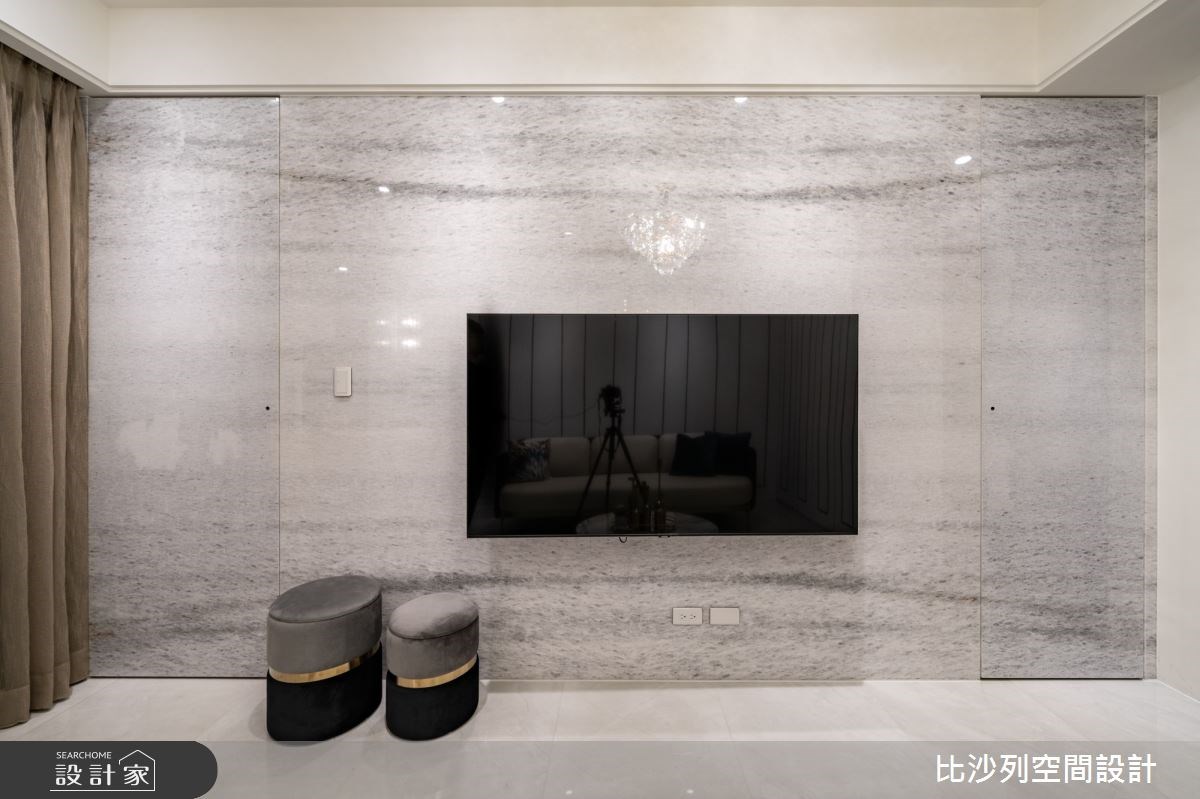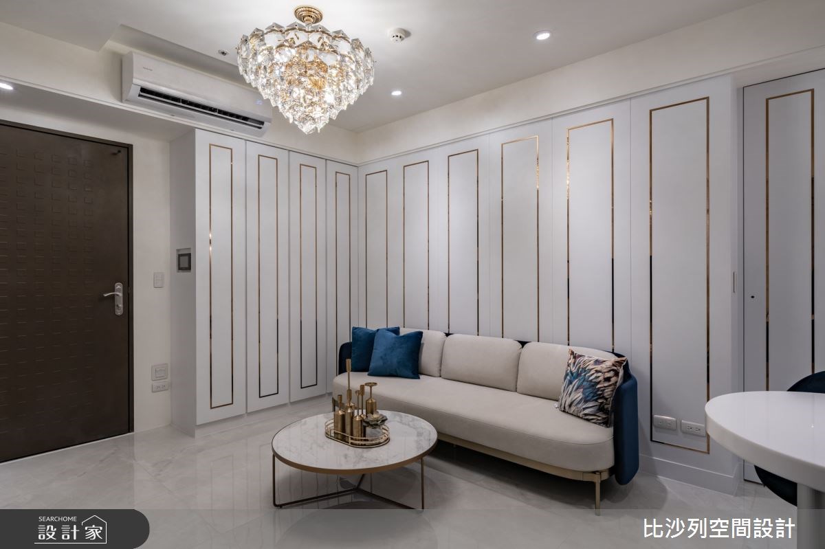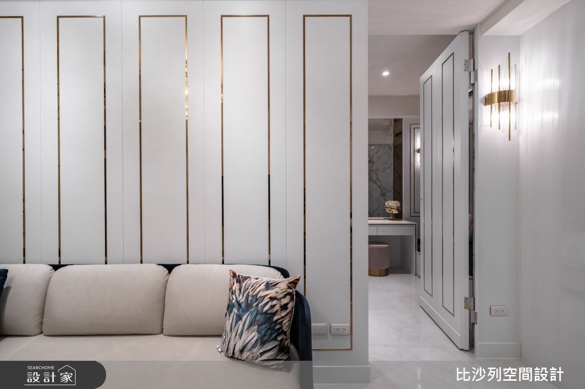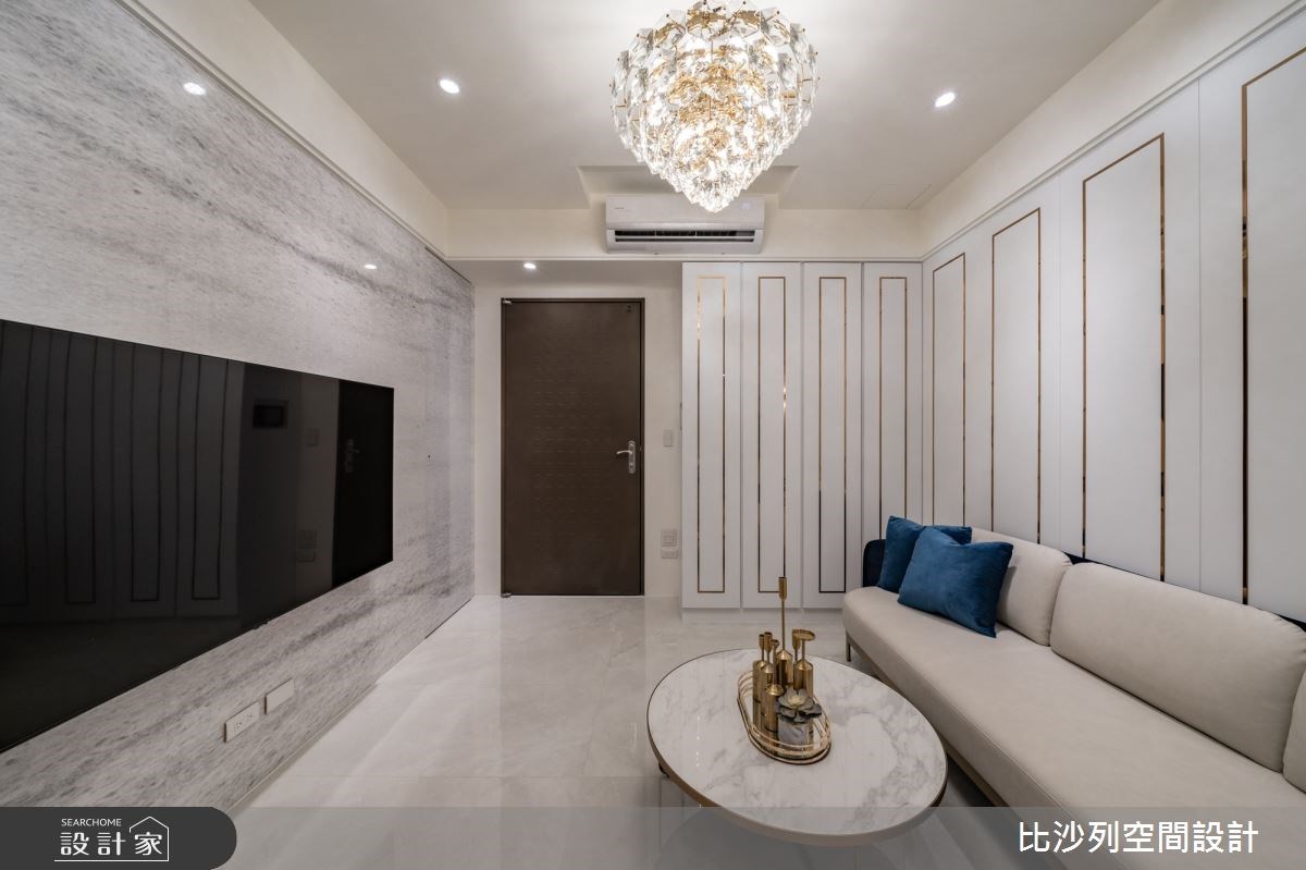 客廳規劃白色收納櫃,並在門上以鍍鈦金屬裝飾,表現高雅奢華的光彩,同時延續相同造型至沙發背牆,拉開寬大的視覺尺度,又能隱藏主臥的動線入口。電視牆則透過大理石妝點,反射著水晶吊燈的璀璨光芒,而牆面的左右兩側,分別隱藏了客臥和衛浴的門片,保持立面的乾淨俐落,給予客廳完整的視聽享受。