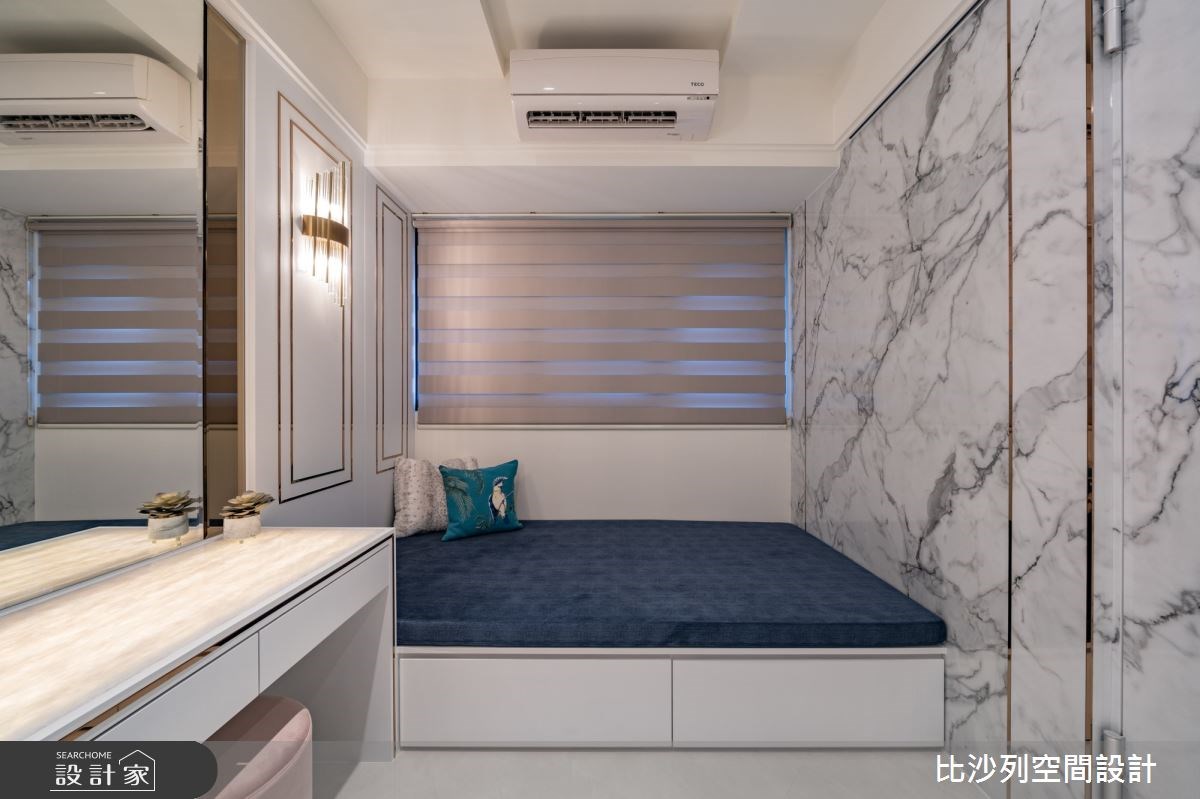 廚房的一面整合機能完備的電器櫃,另一面則從流理檯面,延伸出圓弧線條的輕食吧台,起床可以在此享用早餐,晚上也能夠小酌聊天,兼具多種使用情境。主臥延續公領域的線板元素,且運用經典藍的繃布裝飾床頭牆,營造古典奢華的睡眠環境。此外,窗邊的收納臥榻特別加寬,讓人可以在此放空小憩,舒適無負擔。