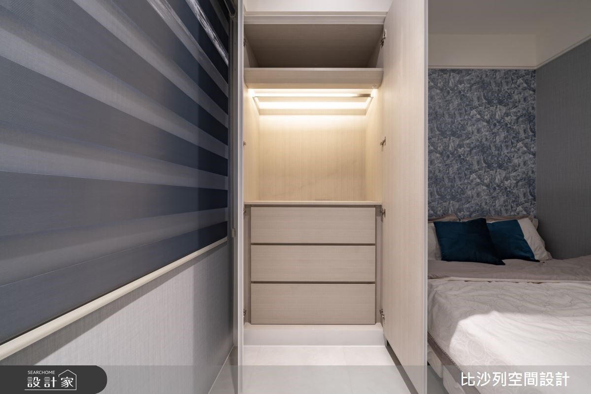 客臥在空間有限的情況下,安排一處線板衣櫃,不只呼應了居家的視覺主軸,還能兼顧豐富的收納機能;櫃內規劃柔和的照明,取用衣物相當便利。