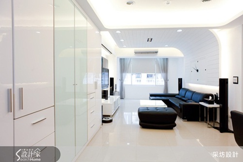 運用黑白色調的對比與大面積的拋光石英磚,使客廳看來明亮寬敞。搭配電視牆造型,大型的隱藏式收納櫃體,不僅提供屋主充足的收納空間,白色鋼琴烤漆更將空間質感瞬間升級。