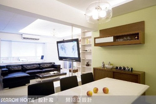 旋轉吧!360度電視! 設計師為節省空間,讓超薄電視機攀附在白色烤漆柱,可以旋轉360度!不論在客廳或餐廳,只要轉動電視,走到哪裡就看到哪裡!