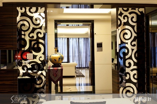 石、黑鏡、烤漆、茶玻等等,結合精緻設計工法,讓空間質感一次到位。玄關空間的大面明鏡是以獨特鑽石切割立體導角的黑鏡框邊裝飾而成,並且以波浪板貼附銀