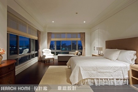 主臥室整體材質以柚木染色木皮,紫檀木地板增加暖度,展現沉穩寧靜的美式風格減壓空間。