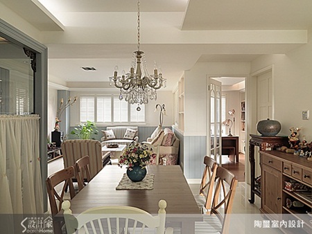 洗白傢具+布飾沙發傳達鄉村氣息 傢具櫃體以洗白塗裝呈現,搭配白色線板,將鄉村氛圍帶到室內。運用鍛鐵水晶吊燈及雜貨小物創造手作感,也營造北歐鄉村特色及樸質風格,再加上印花壁紙及粉嫩色碎花及格紋布飾沙發、坐墊及抱枕,傳達濃厚鄉村味道。