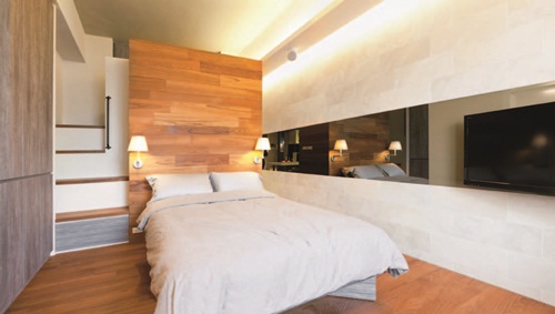恰到好處的自然況味 緬甸柚木的木地板床,在設計師的轉念創意,塑造出頗具個人特色的床頭板,不同於一般採繃布或是張貼壁紙的做法,木紋特有的紋理,頗具安定心神的效果,作為床頭板恰到好處。