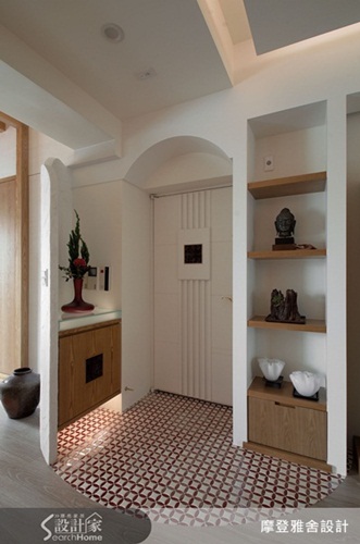 玄關大門以木作包覆的方式,讓大門也可穿上中國風的新衣,格柵語彙和潔淨白色打造清爽東方味,局部地板鋪以銅錢馬賽克磚,不僅美觀也有招財的意涵。