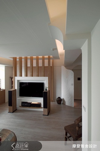 將電視牆結合木作隔柵延伸至天花板,行雲流水恬淡秀雅,也覆蓋了壓樑的窘境,延伸至後方整面的木質櫃體設計,讓所有東西都能收得「俐落體面」。