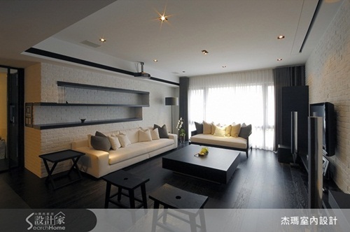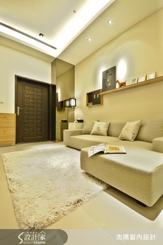 簡單設計創造美觀的牆面 沙發背牆利用層板以及一個類似小壁櫥的設計,做為牆面的主視覺效果。層板上可擺放照片或展示品,搭配具光燈帶來極佳的展示效果。而小小的壁櫥可擺放鑰匙,同時也遮掩了總電源開關箱,達成美化空間的目的。