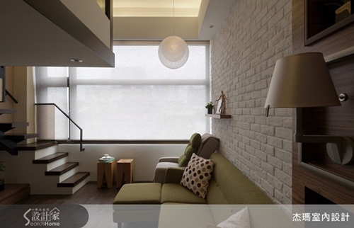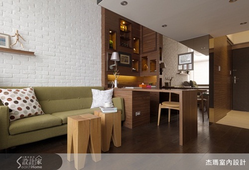 文化石搭配木皮帶出文人氣質 屋主對於顏色喜好希望能盡量單純,設計師在客廳主要牆面選用屋主喜愛的白色磚牆,由文化石磚牆從客廳延續到具有內玄關功能的書房,帶來視覺上的一致性;櫃體面材藉著鋼刷天然木皮的質感與肌理突顯出人文居家本質,內凹的收納空間設計,更為立面帶來具層次的視覺效果。