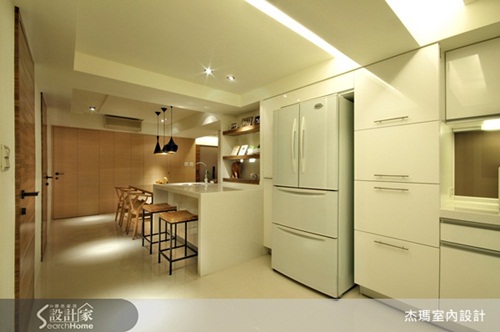 隱藏式設計讓牆面更平整 在通往廚房與餐廳的走道空間,設計師結合暗門設計規劃了儲藏間以及浴室,滿足屋主的收納機能也同時兼具美觀效果,也帶來平整而乾淨的視覺感受,牆面設計以木皮為主要建材,為空間創造溫馨舒適的氛圍。