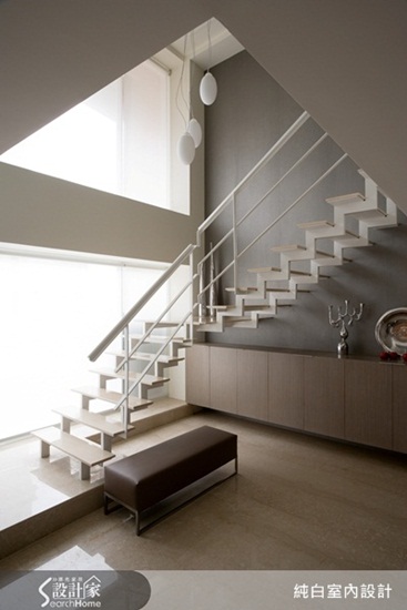 看似平凡無奇的梯間,卻充滿難以言喻的設計感,秘密就在於設計師採用低彩度的色調降低對結構的干擾,讓空間中的線條能夠乾淨清爽地勾勒成形,灰色的背景沉穩地襯托著白色的梯架,渲染出寧靜的時光。