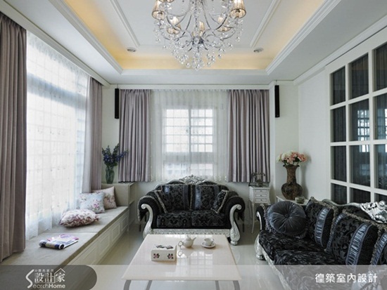 本案為三層樓的透天厝,從一樓踏進玄關進入客廳開始,線條繁複的黑系古典沙發、白色的格柵窗及簡單的線板設計風格,串連了電視櫃及窗邊臥榻,讓人感受到濃厚的休閒渡假情境:此外,空間跳色處理運用亮眼的桃紅電視牆,創造出視覺聚焦的效果,再搭配水晶吊燈綴飾,除了展現奢華的時尚新古典氛圍,也帶出飯店式居家的大器與休閒感。 徨築設計林洋設計師一開始與屋主溝通時,屋主即表示希望以新古典的語彙為設計概念,也是女屋主喜愛的風格,而男主人也表達希望在空間注入原木自然的質樸氣息,也因此最後成就了兼具人文藝術與時尚奢華的品味居家;除了公共空間展現這樣的語彙,元素也延伸到後方的餐廳,明亮採光穿越實木的天花格柵,讓樸實的原木餐桌椅在光影間展現質感,搭配粗獷的文化石牆面,為這個空間營造難以取代的人文況味。 而進入私密空間,也延續公共空間新古典質感的設計概念,運用粉紫色漆面床頭牆,結合淺木色地坪,打造溫馨浪漫的舒眠空間。臥室床旁的格柵摺門則可進入更衣室,利用古典線條及噴沙拉門兩種建構元素衣櫃線條,不但讓更衣室更豐富有變化,同時也增加衣物收納性,一舉數得。