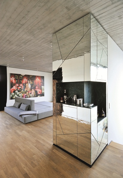 如果有一個120坪大的舊公寓,對它的新貌會有怎樣的想像呢?兩位不到三十歲的德國設計師組成的Oskar Fabian Architecture Studio,從一個公寓改造計畫的競圖中勝出,2010年起著手改造這個位在柏林市區內的一個兩個樓層公寓。在實地勘查過這個大坪數的公寓後,發現雖然室內坪數不小,但內部格成許多狹小、封閉的房間,設計師決定還給原有坪數該有的開闊感,拆掉一些阻斷動線與光線空氣的牆面,讓它成為一個大開放式空間,給空間一個新的邏輯,休息室、酒吧、廚房,透過連續性的語彙讓不同功能的空間得以串連。 室內坪數不小但樓梯和兩間客臥位在空間中心位置,如何界定空間同時串連設計語彙是一大考驗。設計師大膽採用「鏡帶」的概念,並請來藝術家Lori Hersberger Jason Martin設計,組成這個鏡帶的這個鏡面並常慣常所見的平滑形式,而是扭曲的反映出室內風景,在鏡中反映出來的,是不斷被扭曲的肖像,既像海面的波紋,也像水面的漣漪,由於鏡面並非等厚均質,製作與施工都是一大考驗,而獨特的玻璃素材,成功打造出這個前衛帶有實驗色彩的現代居家。 這些看起來很炫的玻璃鏡面,同時也是具有收納、陳列功能的櫃子,而較低矮的檯面鋪上綠色大理石,擺上坐墊與抱枕就是絕佳的休息區。這條「鏡帶」從入口廊道一路延伸至開放廚房與四周窗下,整面鋪陳或高或低的安排,讓空間更具層次感。 另一個聚焦點是邊緣切割成斜角的6公尺長大餐桌,它是設計師特別為這個空間設計,可以做為餐桌,也可在此工作或聚集,這種不規則的動態的配置,加上還可分開成兩張獨立的桌子,讓使用者有更多運用可能。