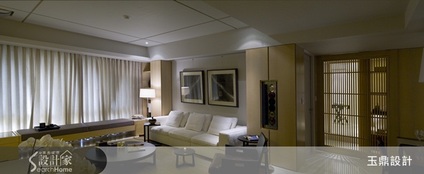 本案利用了格局上的設定,並結合屋主喜愛日式空間的簡約特質,將客廳區域塑造成方正的區塊。設計師在天花板使用溝縫強調線條表現,另外再搭配上沙發後方像是柱子的對稱櫃體設計,將空間感變得方正乾淨,除有視覺美感,也讓樑柱全部都藏了起來。