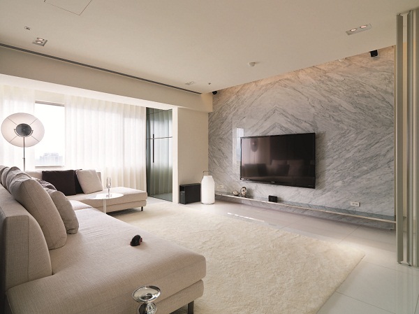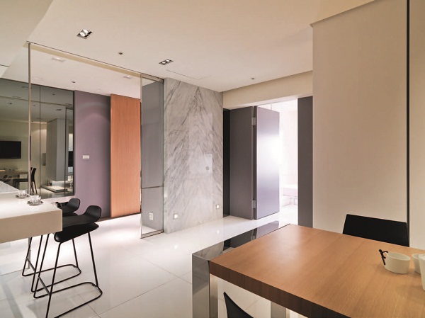 主要空間的部分,強調開放式設計。為了不將本已有限的居家空間浪費於動線之上,凌志謨幾乎去除了空間中的廊道設計,甚至在居家空間的後方,更拆除一整個房間,改以一座中島吧台作為廚房與開放空間之間的中介元素,並一路延伸形成男主人夢寐以求的書房。