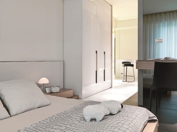 在書房與公共空間的區隔上,凌志謨以一道透明格門作彈性隔間設計,於界定了兩者空間的機能使用之外,也同時預留了未來裝設捲簾的位置,讓屋主如想擁有單獨的私密空間時,只要拉下捲簾就能完全區隔內、外空間。這樣的設計,也讓這個小空間得以同時被轉化為更衣室使用,可說是一舉數得。