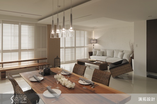 既然以休閒放鬆為空間需求,在傢具的選擇上,設計師也因此選擇了具自然質感的籐編以及木質傢具,並與落地窗戶引入的大量自然光線,相互映照出了恬靜自然的空間情調。而隨著收納需求的降低,空間也因此少了眾多收納櫃體的身影,改而給予客、餐廳更寬敞的使用空間,在簡單的傢具配置與空間色調烘托下,形成恬靜自然的生活風格。 然而,靠海較近、又擁有極佳的高度與視野,雖讓屋主可以輕鬆眺望周邊美景,但在擁有美麗風景的同時,卻也因為距海較近的緣故,在冬季時必須面對強勁的東北季風與較為潮濕的空間環境。因此,設計師決定以百葉窗替代一般常見的布質窗簾設計,除了透光與通風的功能外,更避免強風吹亂窗簾,干擾空間視覺與舒適性的情形發生。此外,當鄉村休閒感十足的百葉在空間中不僅不顯得突兀,更正好替追求休閒氛圍的居家空間添入更多輕鬆質感,可說是一舉數得。