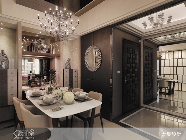 要打造帶有奢華感的用餐區,其實不需要太多繁複的線板,設計師採用一片落地鏡搭配大理石牆面,維持簡約高貴,卻能提升餐廳區的高貴、奢華度。