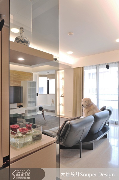 玄關與公共空間之間,藉由木作與染色玻璃界定,藉由櫃體的設計,可以滿足玄關入口隨手擺放物品或展示品的機能性,染色玻璃的使用不僅讓視覺可自然區隔客廳與玄關,同時可穿透的視線比封閉式的櫃體設計更具有彈性,間接帶來放大空間的感受。