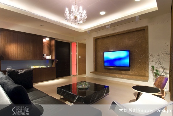 電視牆搭配的材質很常使用大理石,藉由石材本身的天然質地以及高貴氣質,常可以適時地將空間的個性與奢華感表現出來。本案設計師結合造型設計巧思,刻意不讓大理石鋪滿整牆,藉由造形設計的結合,達到讓空間更聚焦的目的。