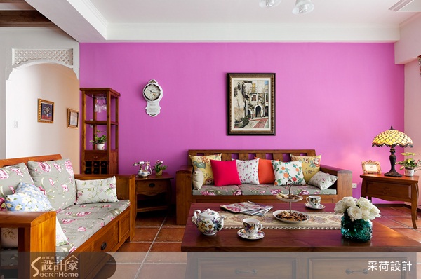 由於屋型為12年的中古屋,雖然格局很方正,但從玄關進門就馬上看到廚房,有所謂「入門見灶」的風水顧慮及障礙,因此,在中古屋的格局改造方面,具有室內設計風水堪輿資格的專業的采荷設計首先建議利用隔牆做為玄關的界定,隔牆除了採用硅藻土手感材質,並運用高彩度的紫色塗料,讓牆面與壁紙及磁磚能夠相互搭配,營造溫馨的鄉村質感,為空間增加樸實美感,在燈光營造下,呈現自然手工紋理;此外,采荷設計還在牆面上規劃小窗,不但讓空間有穿透性,也營造視覺端景,整體牆面色彩連結到客廳空空間,以鮮明、飽和度高的紫色、橘色和綠色為主,也符合南歐風情及綠居家生活概念。 從玄關進入公共空間,馬上吸睛的是客廳的壁爐展示櫃,運用木作手染仿古處理及搭配火頭磚所砌成,是最大的視覺焦點,也呼應手感的硅藻土牆,再搭配樸實的復古地磚,整個空間充滿浪漫的南歐風情。而采荷設計在書房以架高地板及各式抱枕坐墊規劃閱讀休憩區,而且只要加上床墊就具有客房的機能,以豐富色彩貫穿整體溫馨的鄉村風格,並散發濃厚的藝術人文氣息。