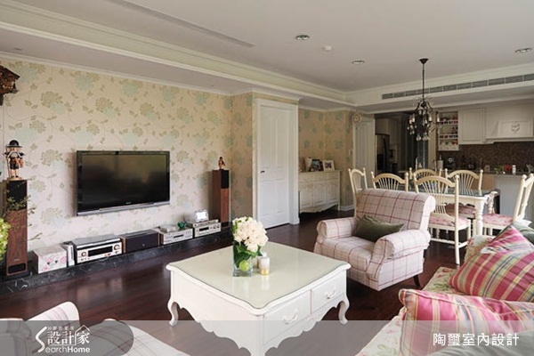 餐廳部份,開放式的設計讓餐廚空間放大,以復古地磚區隔出空間界定,吧台兼具料理中島的功能,純白廚具搭配繽紛的馬賽克牆面,是重要鄉村風元素,也使料理做菜的心情更加愉悅。 主臥室則採玫瑰圖騰的地毯及窗紗、淡雅的銀白色壁紙牆面、四柱床裝扮上浪漫布幔,瑩白潔淨的美感應運而生,透過燈光及圓弧造型主牆,讓空間多了一些異國雅緻風情,也多了沉穩特質,並讓視覺往上拉高,創造空間焦點。女孩房以粉嫩色調為主,小花壁紙及蝴蝶窗紗將女孩房佈置成公主城堡般,從窗紗中隱約透露的光影,營造出小女孩的甜美浪漫氛圍。