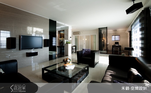 本案空間以白色地坪為基礎,配置深色系列的量體作為空間主題,包括擁有自然紋理的深灰色大理石、深色系的沙發與家具等,讓空間的整體視覺重量比例平衡而穩定。設計師並且開設了大面落地窗引入室外的自然光線,明亮的光感讓整體空間更具大器感。