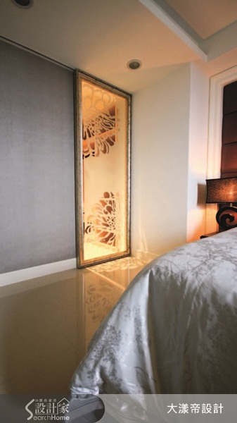 床頭主牆以白色線板框架搭配沉穩的裱布,營造寧靜的睡眠空間。對稱式床頭燈,搭配窗邊立燈,滿足閱讀、休憩需求,多層次的燈光設計,成功塑造飯店式寢居氛圍。