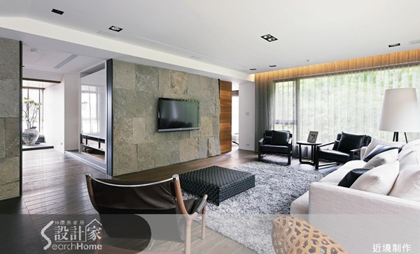 配合著室外良好的綠色視野與充足的自然光線,設計師以最樸實而帶有自然拙趣的概念來打造客廳空間,並且選用具有特殊質感的燒面石材打造電視牆,再加上木質地板鋪陳,創造最舒適自然的美好生活。