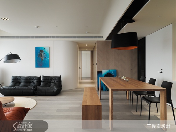 在以現代簡約為基礎的空間中,落於空間左側的鋼琴,首先展現屋主本身音樂素養;搭配不規則線條切割的置物架,和色彩明亮的畫作,不僅展現屋主本身個性,也為空間帶來畫龍點睛的效果。