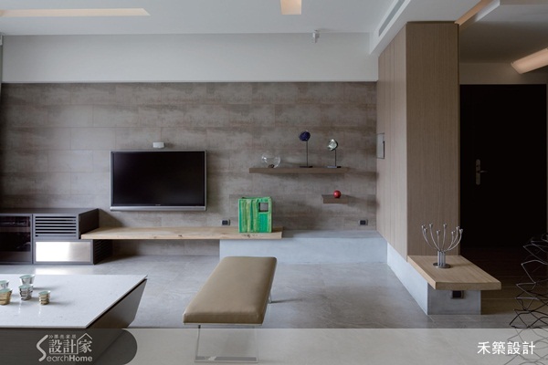 由於電視牆的寬度足夠,而玄關入口又需要具有空間上的界定和區隔,考量到不犧牲空間的寬度前提下,設計師在玄關與電視牆之間設立的與空間等高的鞋櫃,此處藉由收納設計,同時滿足空間區隔與機能性的需求。