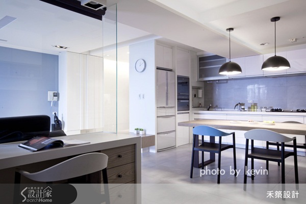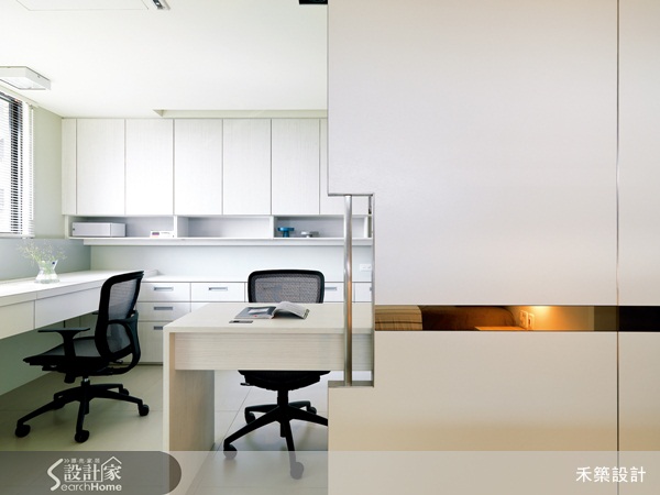 清玻璃隔間是目前所有的居家空間設計中最常見的隔間手法。在此處,設計師使用清玻璃結合書桌的方式,直接界定了書房與客廳的區域,而清玻璃的使用,也因為視覺可穿透的特性,維持了空間的開闊度。