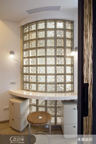 在更衣室的化妝台以及隔壁間的衛浴空間區隔,設計師結合弧形的造型以及玻璃磚牆達成。這樣的手法保留了光線穿透的可能,同時也暗示另一個空間的存在,解除了更衣室較為狹小的壓迫感。