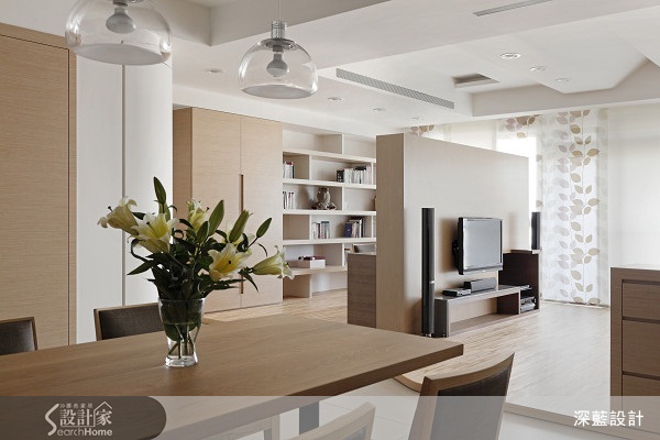因為空間本身擁有極佳的採光優勢,設計師將書房與客廳規劃於同一區域裡,讓整個空間都能享受溫暖明亮的陽光。而為了讓區域有所界定,設計師將書房區域的地坪架高並以木地板鋪陳,展現清爽的設計風格。