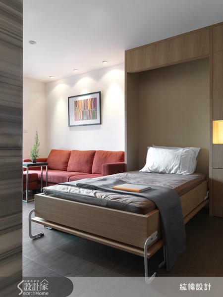 客廳沙發旁的收納櫃門片下拉便是一張標準單人床,充分利用動線空間。