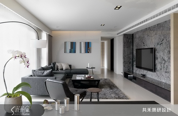 採光明亮的現代客廳,以黑白灰等簡易色彩作為基調,搭配大理石電視牆放大空間,構成俐落視覺,再配上自然植栽和風格掛畫做裝飾,豐富原本過為單調的色彩元素,帶來畫龍點睛的效果。