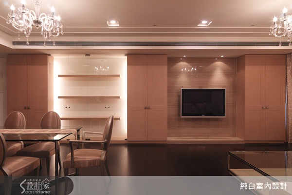 同樣是木皮貼片材質的櫃體門片,因為加上了線條、線板設計,馬上創造出古典感,與古典風格的整體空間更為融合。