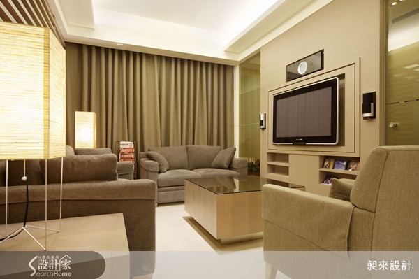 在客廳空間中,設計師結合採光優勢,以米白色系以及橡木色搭配營造電視牆的主視覺效果。在這個案子裡使用胡桃色、橡木色和米白色構成主要的顏色調性,木質的溫潤感受,豐富了空間視覺的層次感。