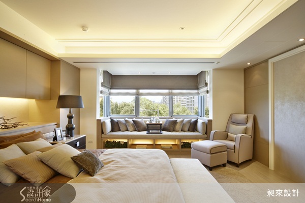主臥房空間中同樣採用了淡雅而色淺的手法來構成主視覺,白色的天花板以及橡木色的壁板為空間主要的色調。在家具和抱枕等軟件的選配上,設計師也不馬虎,此處以白色或淺灰色等色調,和空間的建材色系相呼應,創造出合諧的感受。