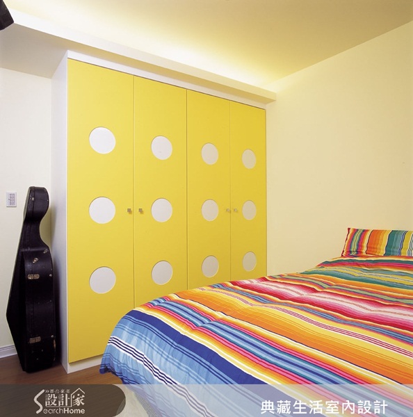 小孩房的空間通常有限,櫃體設計也必須恰到好處才不會浪費空間。設計師在此處除了結合多樣化的抽屜櫃與五金製作衣櫃,門片上也使用鮮黃色以及圓形圖案創造豐富的視覺效果,以呼應居住者的個性和年齡。