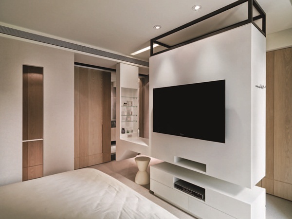 由於主臥空間有限,無法規劃更衣室,但屋主又有很多衣物需要收納,王俊宏除了倚牆規劃大面衣櫥外,並結合電視牆、衣櫥及妝梳台規劃了多機能櫃,為了不讓櫃體顯得壓迫,設計師以木作結合鐵件設計了上下懸吊櫃,高難度的工法成就出開闊的空間感。