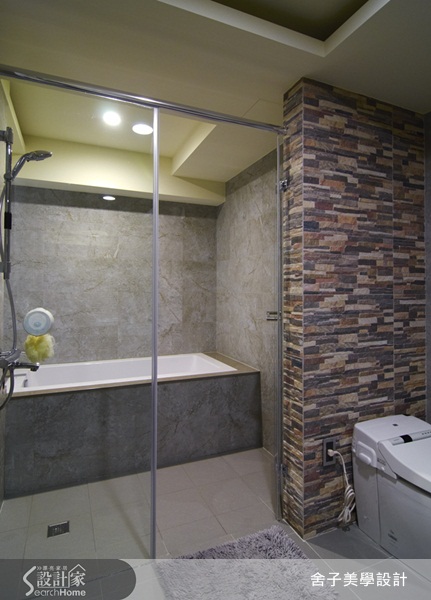 狹小的衛浴空間透過石材點綴,也能製造大器感。運用不同質地,以及不同大小的板岩做拼貼,保有原空間的機能性之外,還能帶出大器氛圍。