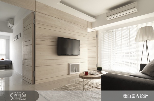 客廳電視牆兩側是隱藏式門片,將兩間臥室巧妙地隱藏於其中,讓整個空間趕在視覺上更為乾淨俐落。