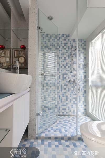 衛浴空間採用抿石子搭配馬賽克磚拼貼,整體感相當清爽宜人,同時也有放大空間感的效果。