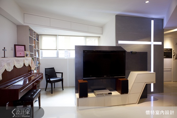 在白色空間中,安插一面自己的信仰與最愛,讓自己每天看得都自在。此例揉合黑鏡、木料、牆體水泥粉光等元素,以整合留勾縫、交接、鑲嵌等收邊工法,柔和地散發一種獨特的美感。