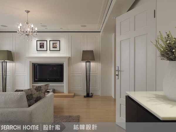 古典居家中常見的壁爐,在現代摩登空間中也能有不同詮釋,設計師把壁爐簡化為幾乎只剩一個白色方框,搭配層板粗細不同的視聽器材展示收納,成為空間最奇妙又時尚的一面牆。